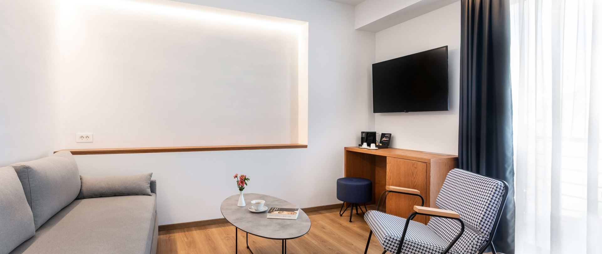 Οι ευρύχωρες Junior Σουίτες 35 τ.μ. είναι άρτια εξοπλισμένες για μια πολυτελή διαμονή στην Πάτρα. Aνέσεις όπως ένα Coco-Mat king-size κρεβάτι, ευρύχωρο σαλόνι με καναπέ και δυο τηλεοράσεις LED 43’’& 50’’, θα σας εξασφαλίσουν μια άνετη & ευχάριστη διαμονή. Επιπλέον, το walk-in shower, τα φυτικά προϊόντα ατομικής περιποίησης, τα αφράτα λευκά είδη θα σας προσφέρουν μια αίσθηση πολυτέλειας.
